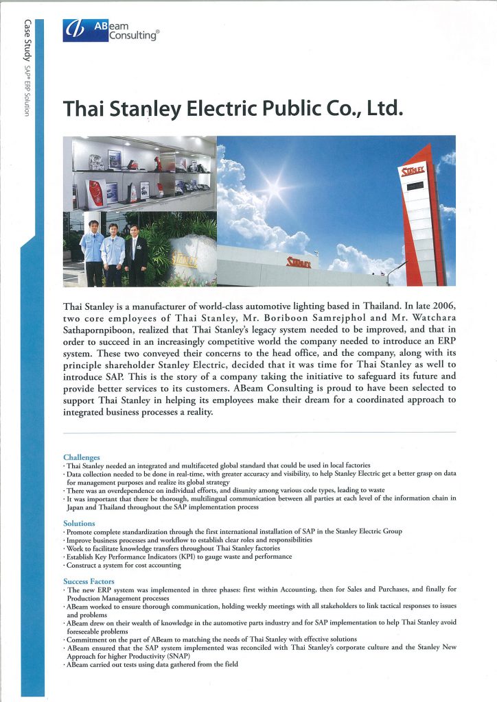Case Study タイスタンレー (英語版) アビームコンサルティング 2010.11.30 非売品 アビームコンサルティングのコンピュータシステム導入事例を紹介するレポート。課題・チャレンジ、ソリューション、成功のポイントを解説。取材執筆・編集・デザイン・校正・印刷を担当。