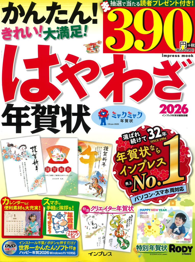 はやわざ年賀状2026 株式会社インプレス 2025.10.07 A4変形判/96P 429円(税込) 2025.10.7 UP 年賀状イラスト、超かんたんソフト、フォント、お試し用紙まで付いて、コスパ抜群オールインワン年賀状素材集!定番のフォーマルデザインはもちろん、和風、エコ、おしゃれなど様々なジャンルの年賀状から選りすぐりのデザインをたっぷり収録!■部分制作(目次~P.74、P.90~91、P.95、奥付) はやわざ年賀状2026 Amazon 紀伊國屋書店
